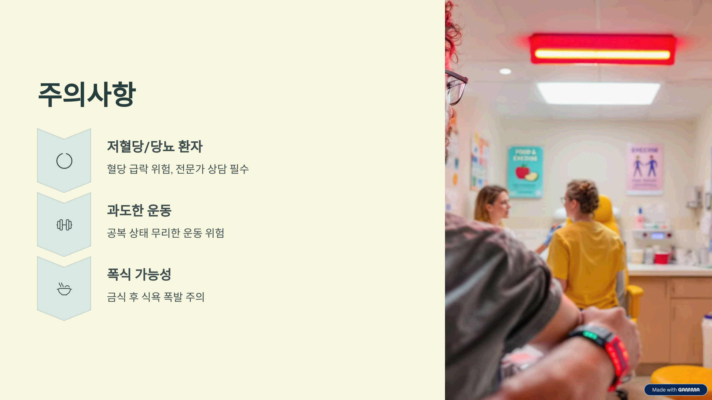| 과도한 운동 병행 | 공복 상태에서 무리한 운동은 저혈압, 어지러움 등을 유발할 수 있어요. |