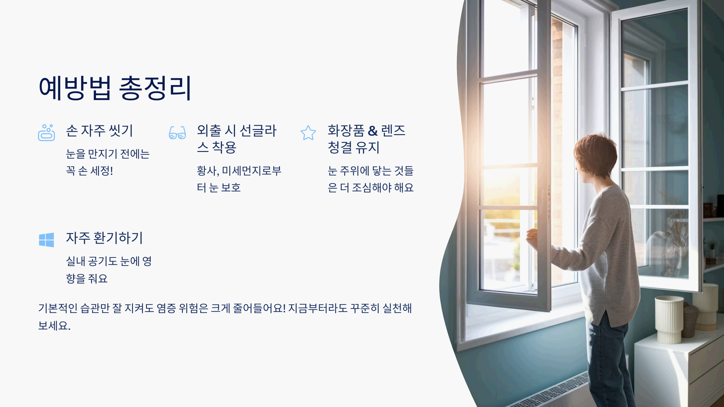 ✅ 손으로 눈 비비지 않기: 감염 확산을 막는 가장 기본적인 수칙이에요.