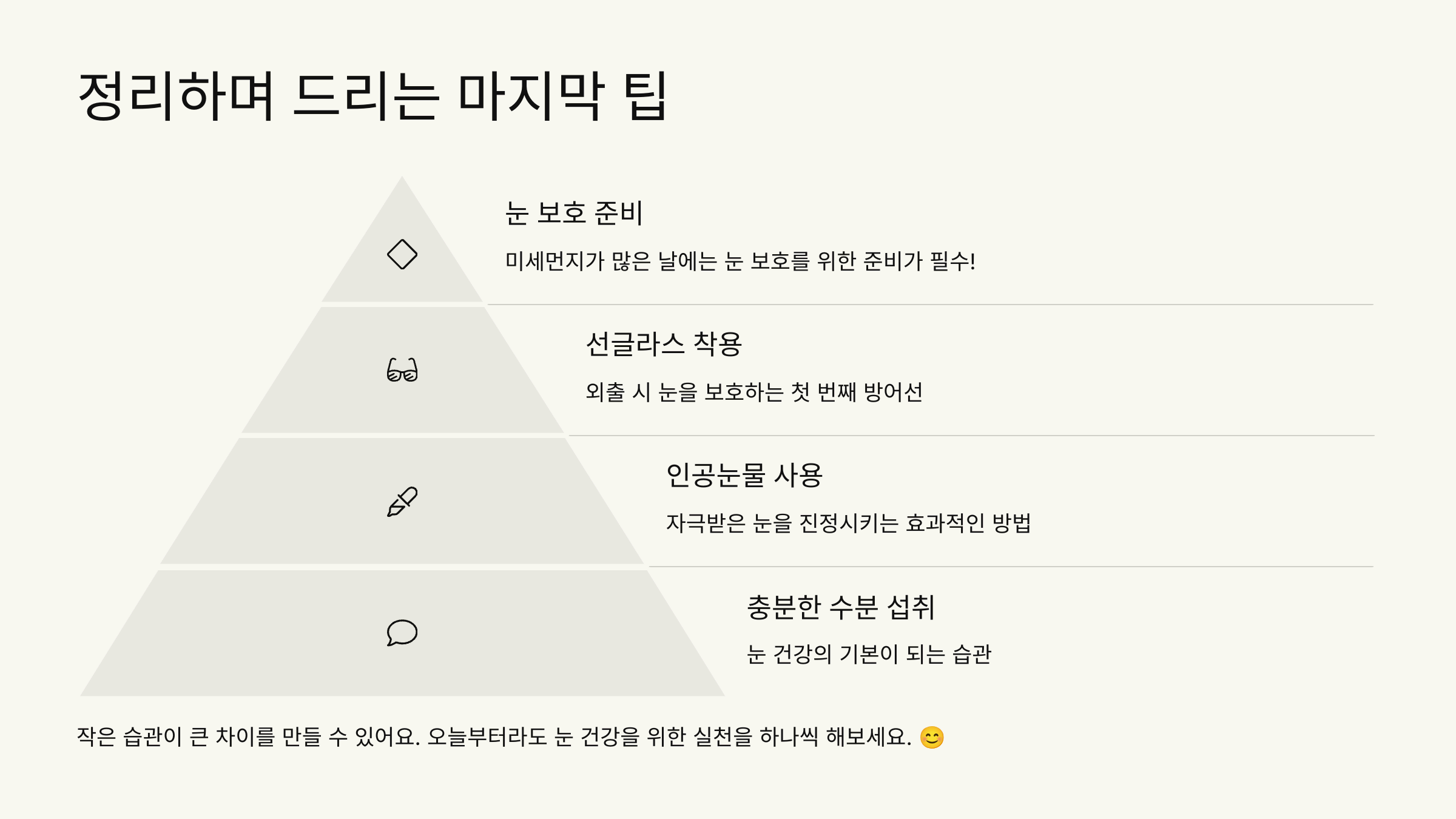 작은 습관이 큰 차이를 만들 수 있어요. 오늘부터라도 눈 건강을 위한 실천을 하나씩 해보는 건 어떨까요? 😊