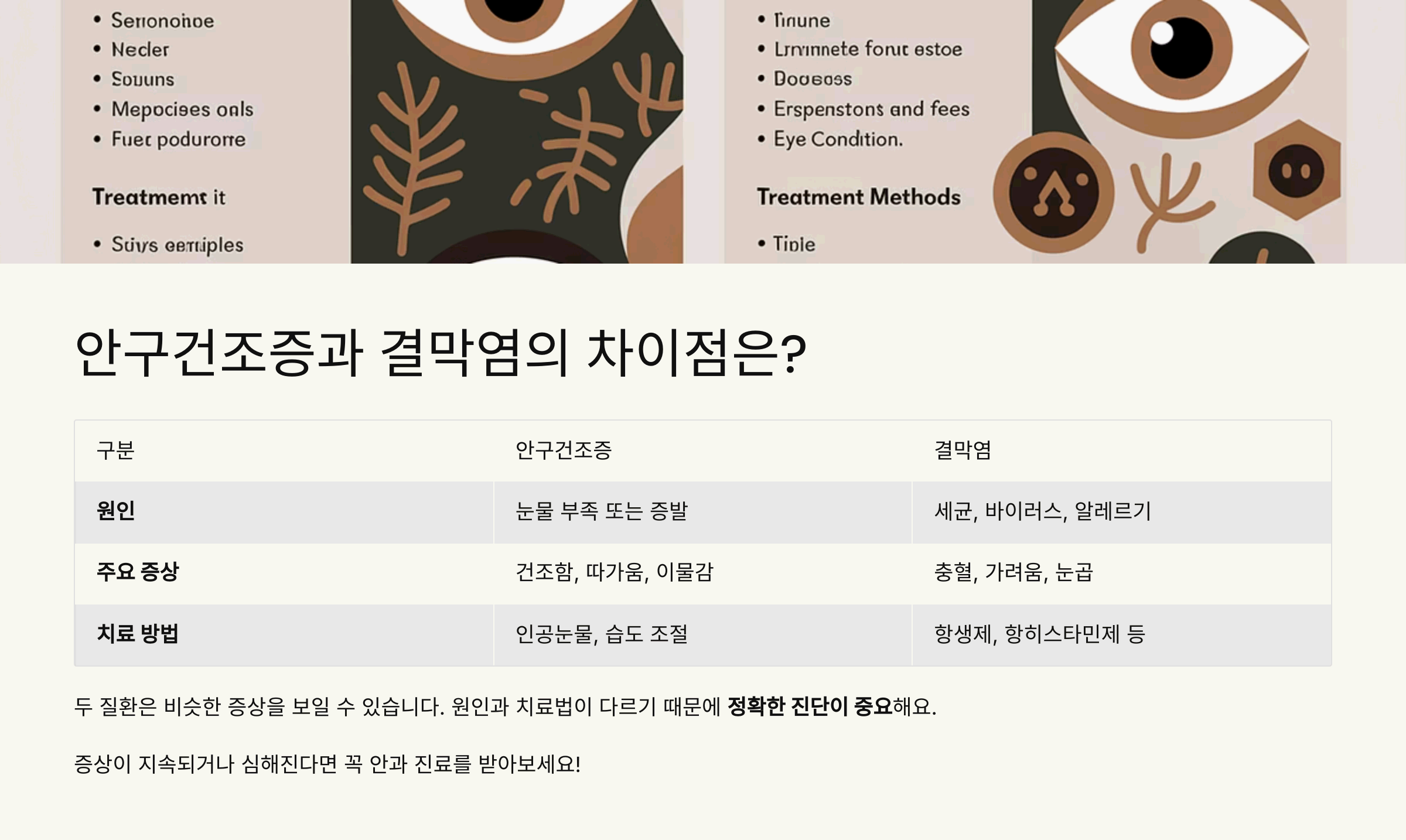 | 치료 방법 | 인공눈물, 습도 조절 | 항생제, 항히스타민제 등 |