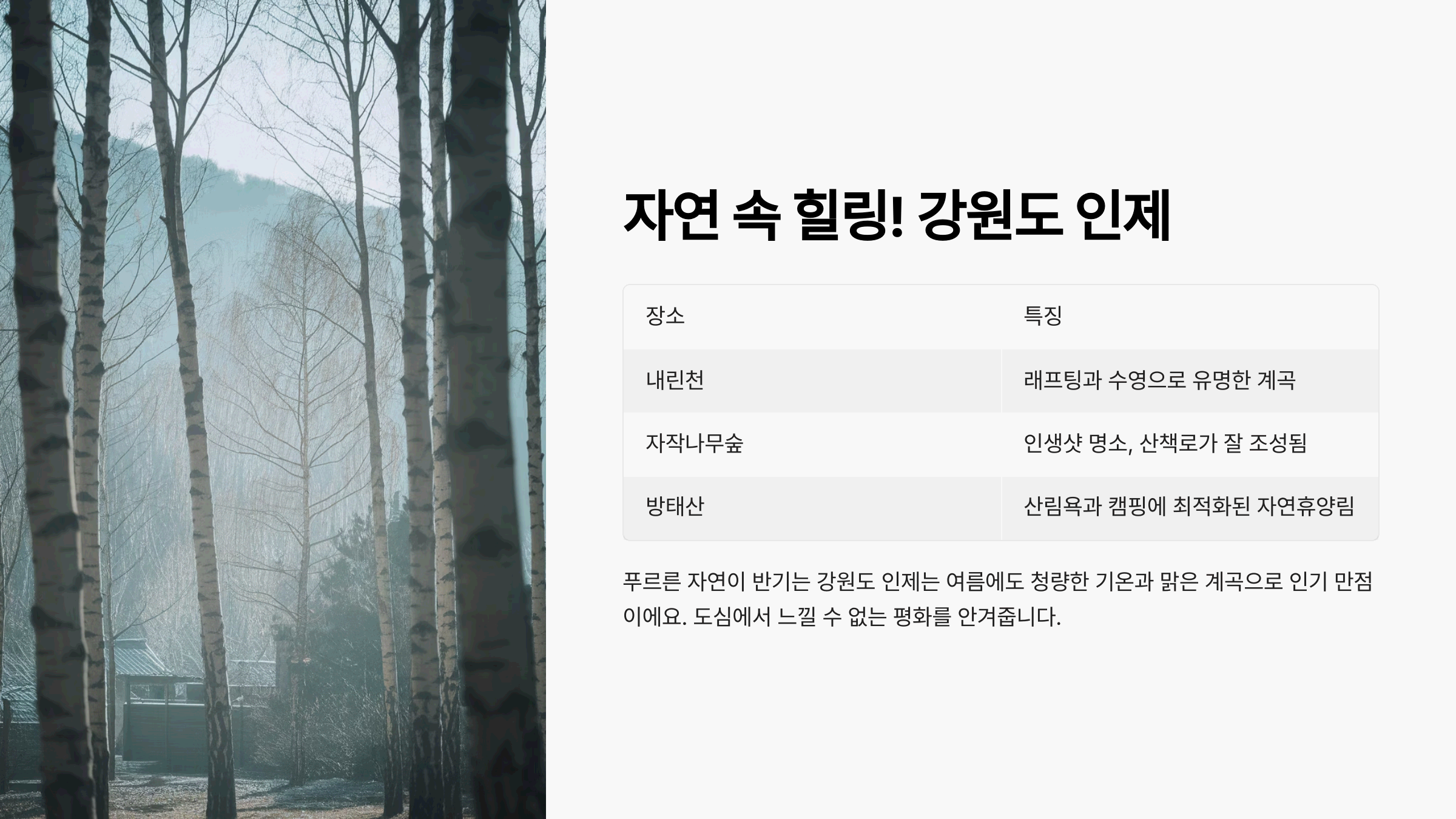 푸르른 자연이 반기는 강원도 인제는 여름에도 청량한 기온과 맑은 계곡으로 인기 만점이에요. 특히 '내린천', '자작나무숲', '방태산자연휴양림' 같은 명소는 도심에서 느낄 수 없는 평화를 안겨줘요. 가족 단위는 물론, 혼자만의 힐링 여행지로도 딱이랍니다.