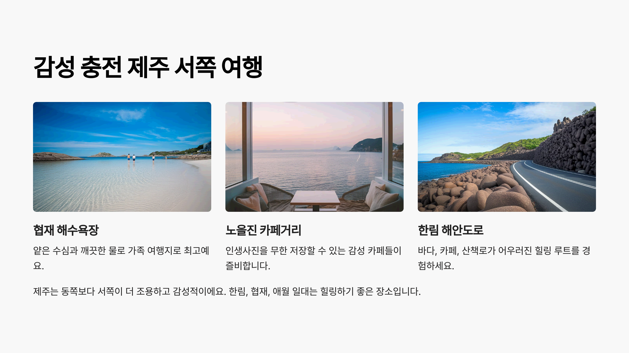 제주는 동쪽보다 서쪽이 더 조용하고 감성적인 거 아셨나요? 한림, 협재, 애월 일대는 바다, 카페, 산책로가 어우러진 힐링 루트예요. 특히 협재 해수욕장은 얕은 수심과 깨끗한 물로 가족 여행지로도 최고고요, 근처 ‘봄날 카페’나 ‘노을진 카페거리’에서는 인생사진도 무한 저장 가능! 감성 여행을 원한다면 제주 서쪽을 추천해요 😊