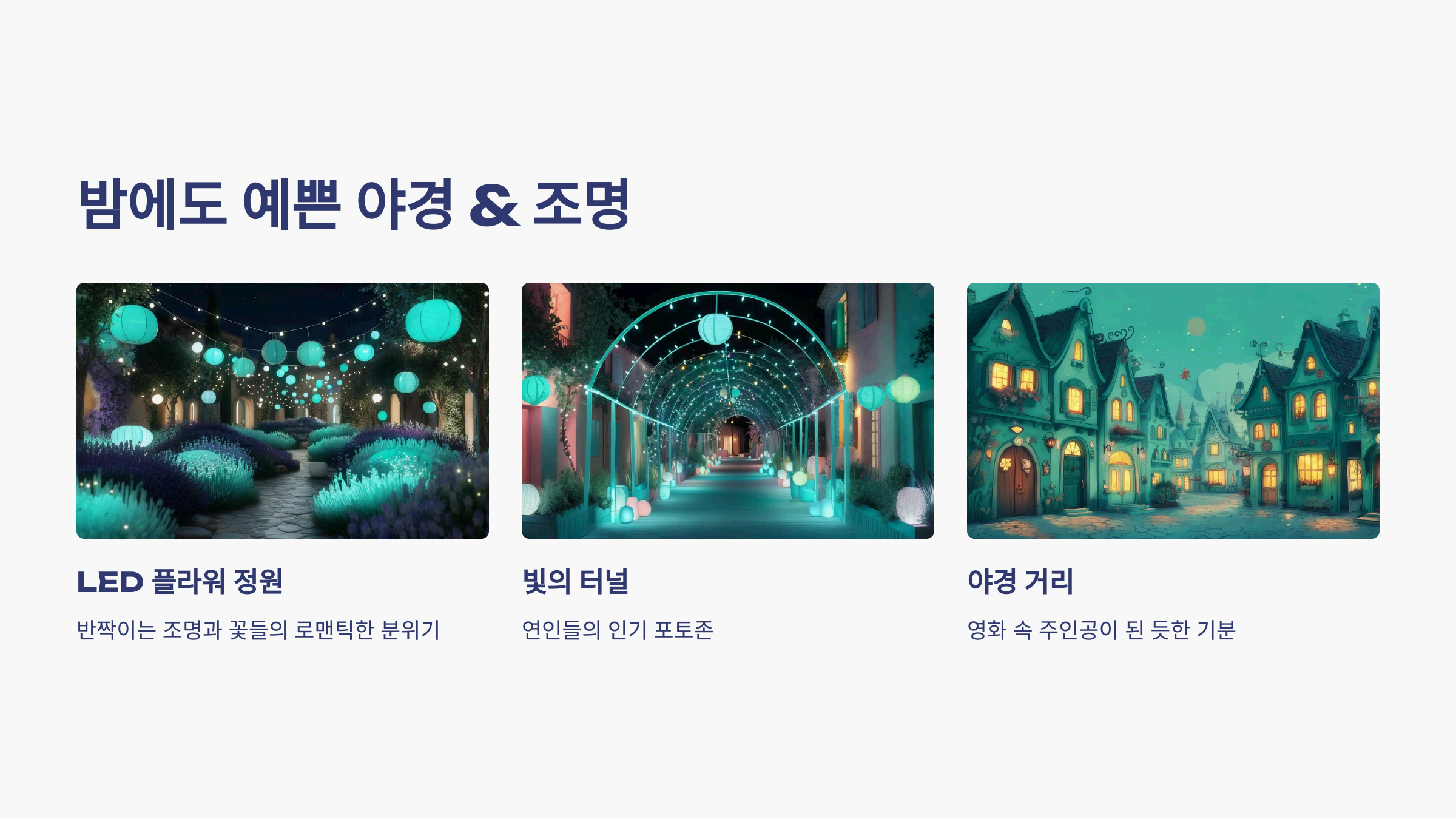 | LED 플라워 정원 | 밤이 되면 반짝이는 조명과 꽃들이 로맨틱 분위기를 선사해요 |