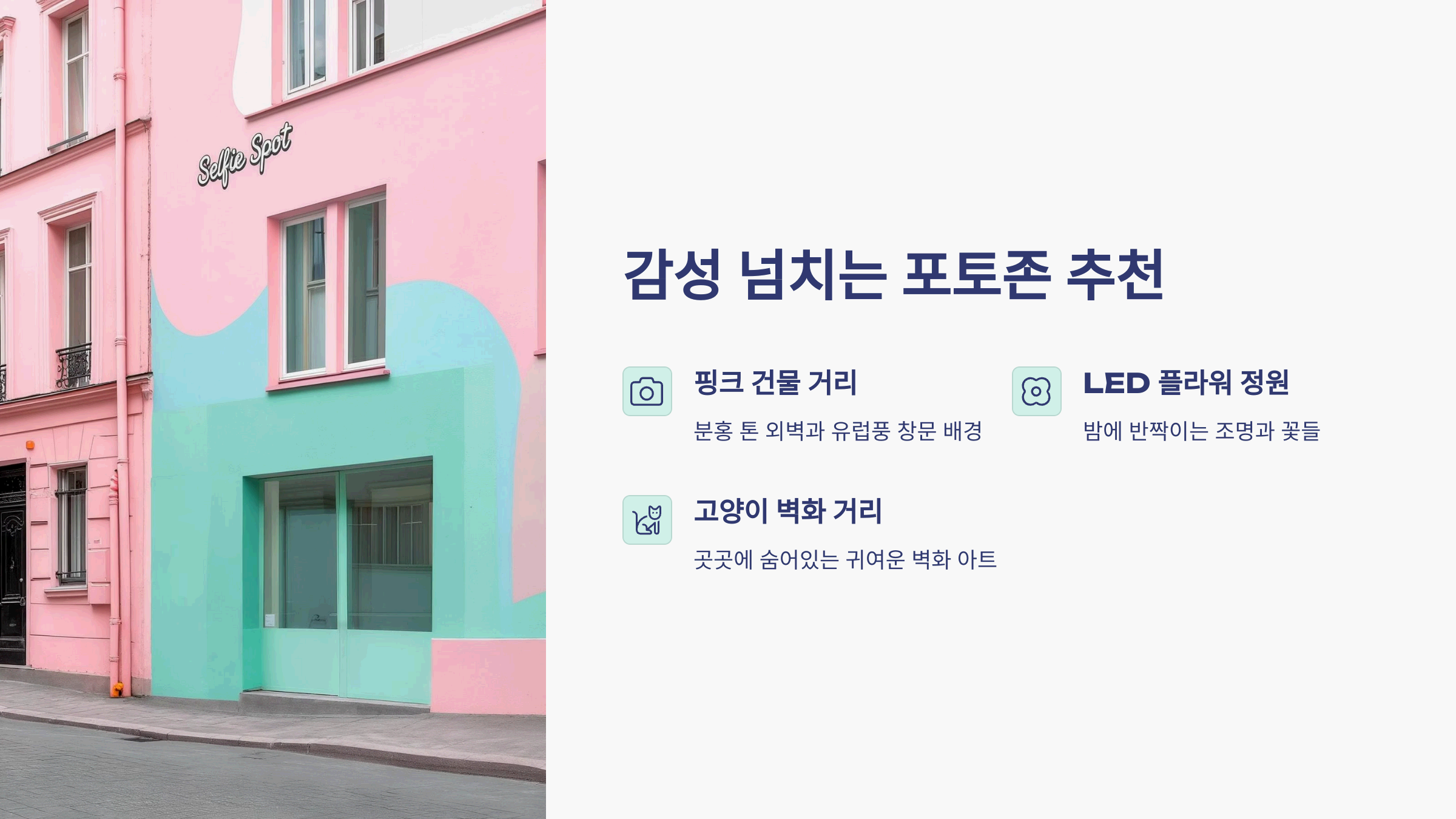 | 고양이 벽화 거리 | 곳곳에 숨어 있는 귀여운 벽화 아트와 함께 개성 있는 사진 가능 |