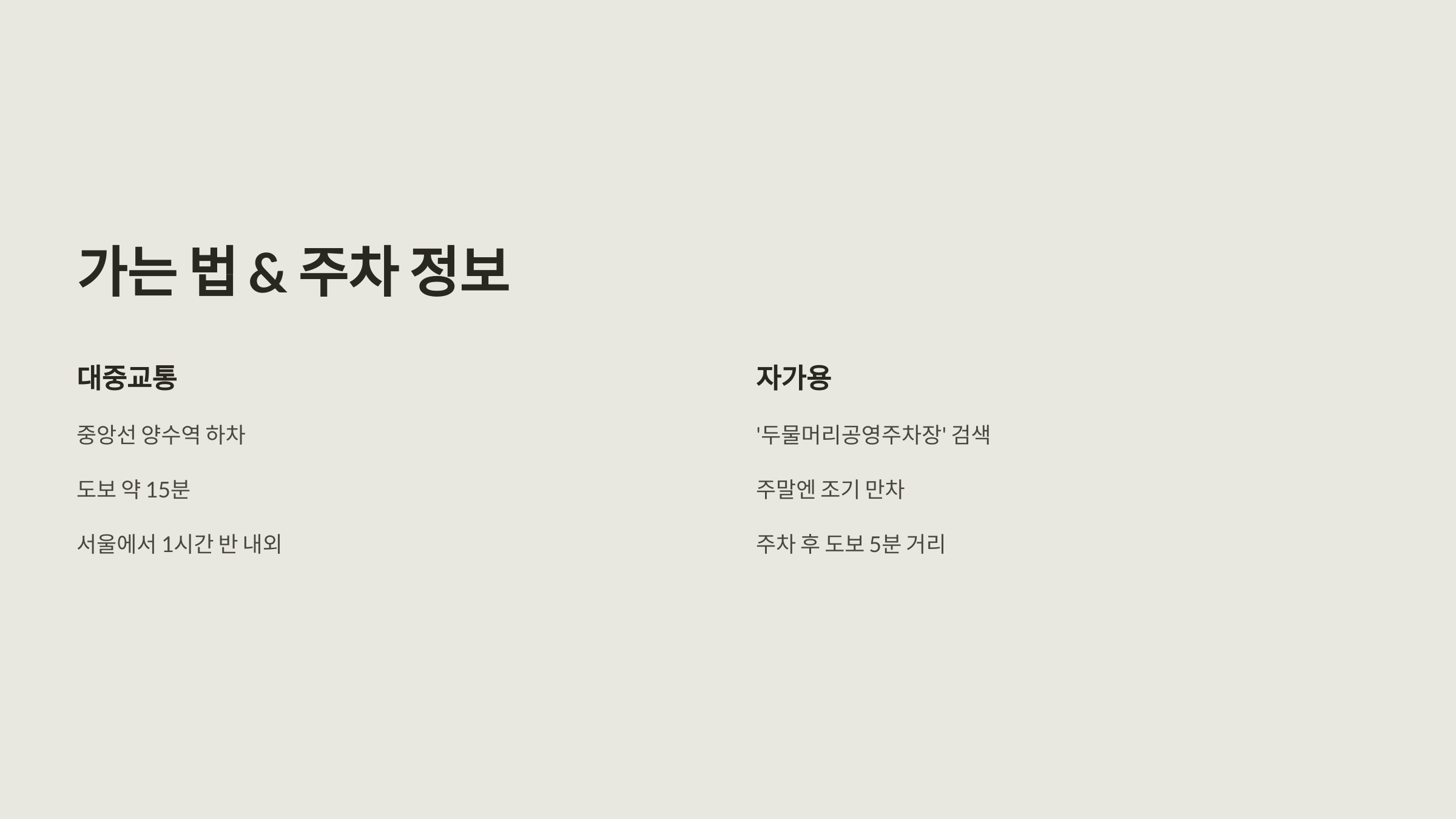 📍 대중교통: 중앙선 양수역 하차 후 도보 약 15분.