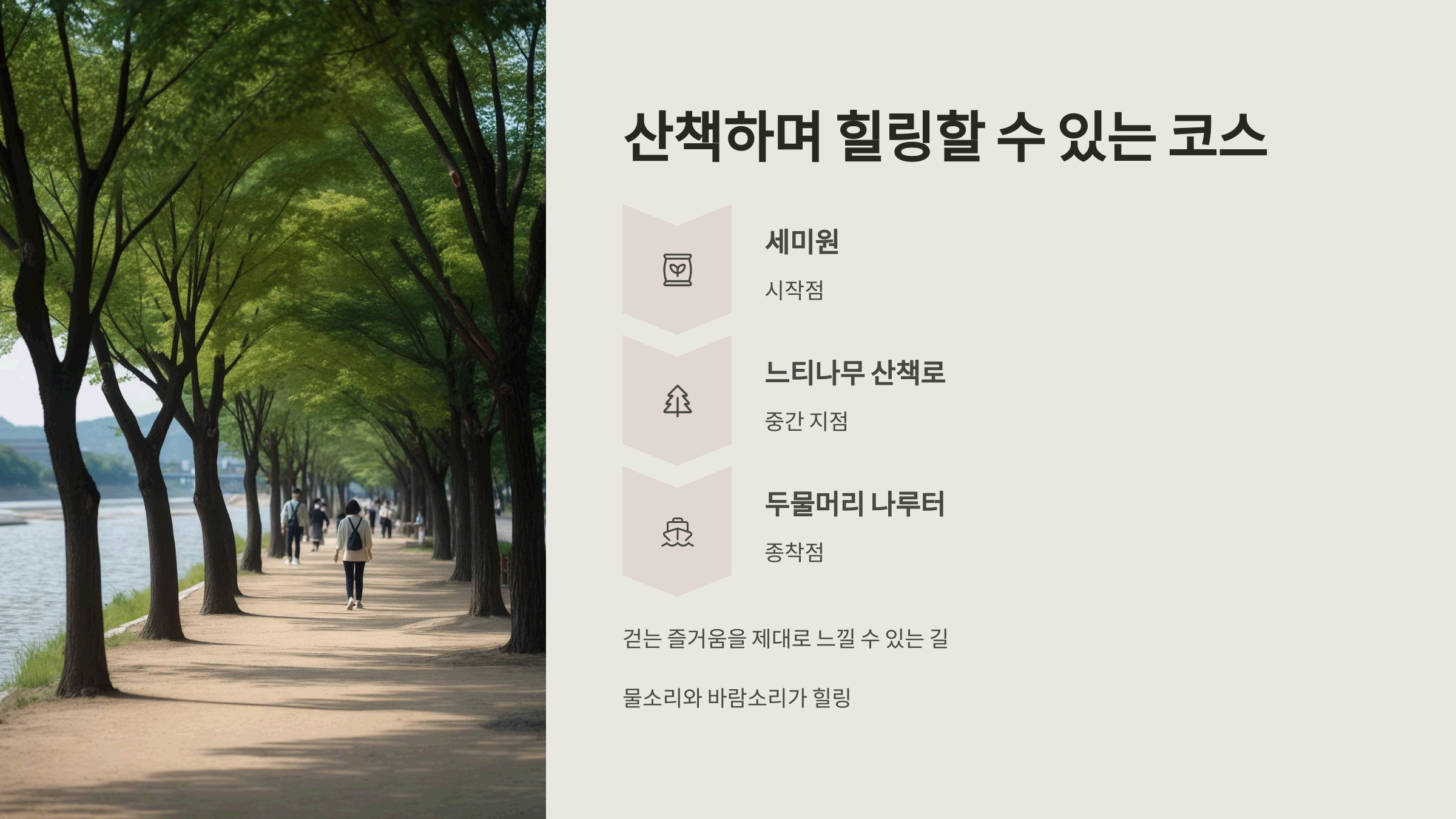 강 따라 천천히 걸으면 양수리 풍경과 함께 마음까지 편안해지는 느낌을 받을 수 있어요.