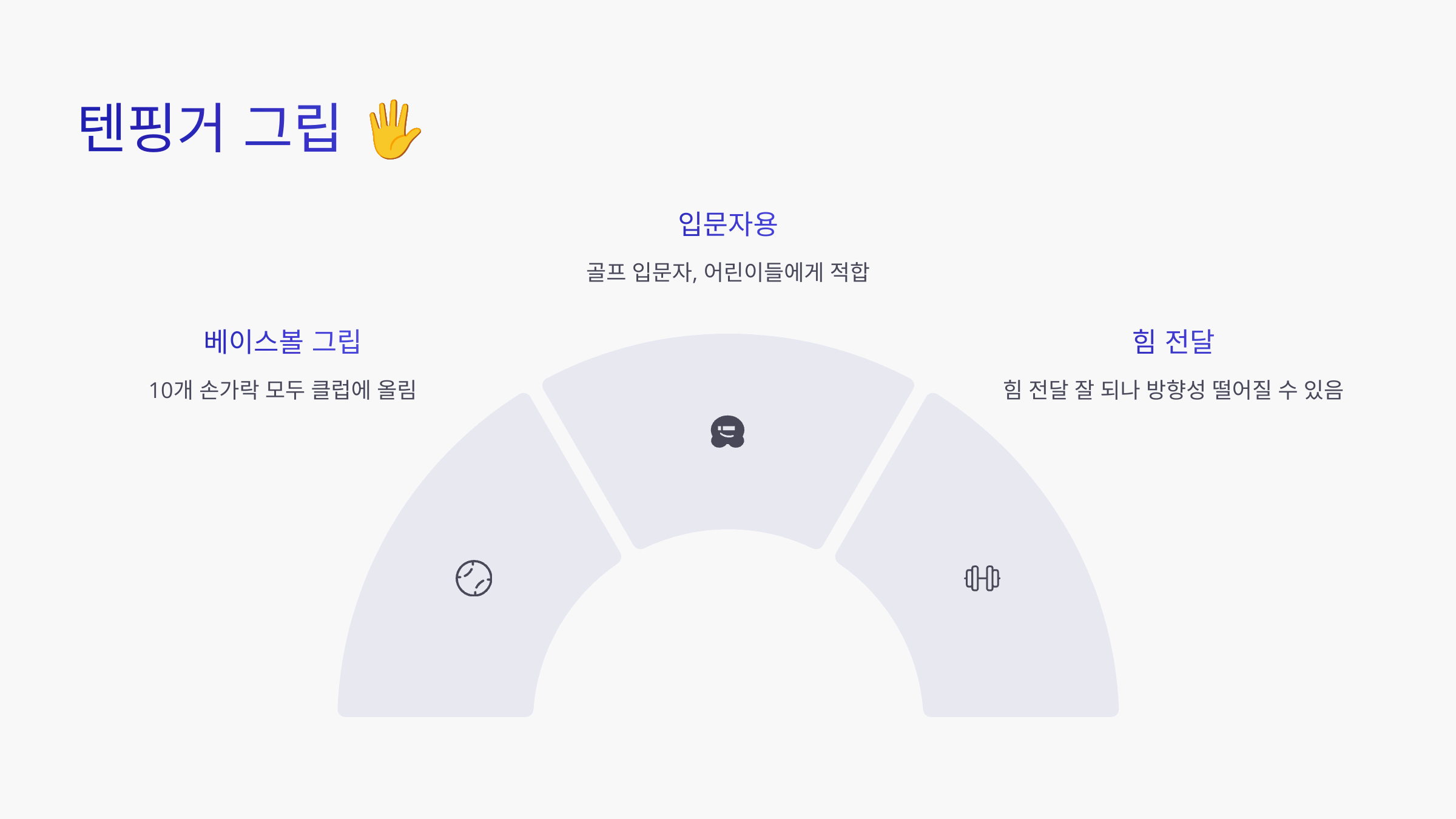 텐핑거 10손가락 모두 클럽에 닿음 힘 전달 용이, 초보자 편함 손 분리로 인한 방향성 흔들림