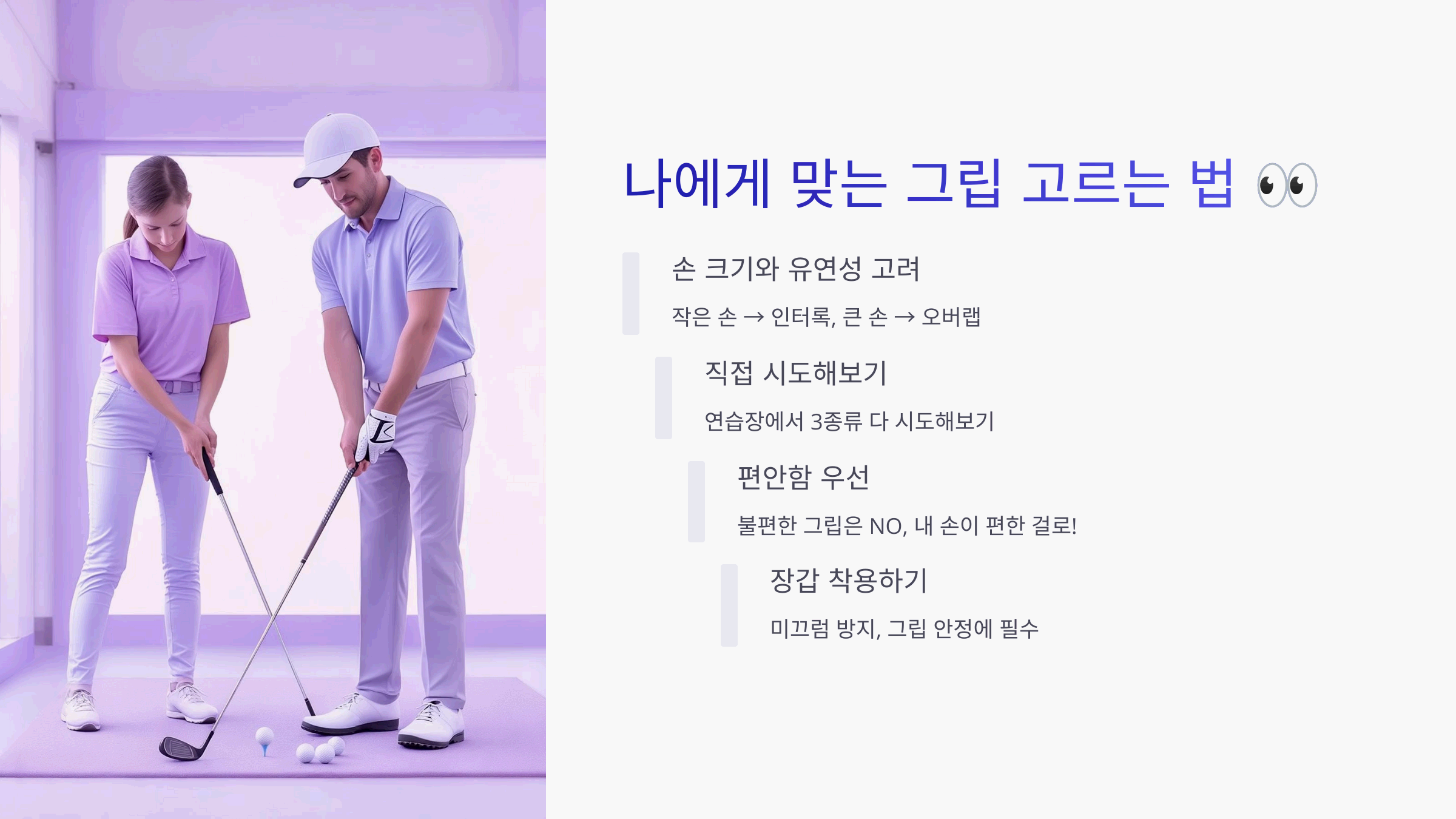 그립은 진짜 사람마다 달라요! 손 크기, 유연성, 스윙 스타일까지 전부 고려해야 하쥬~