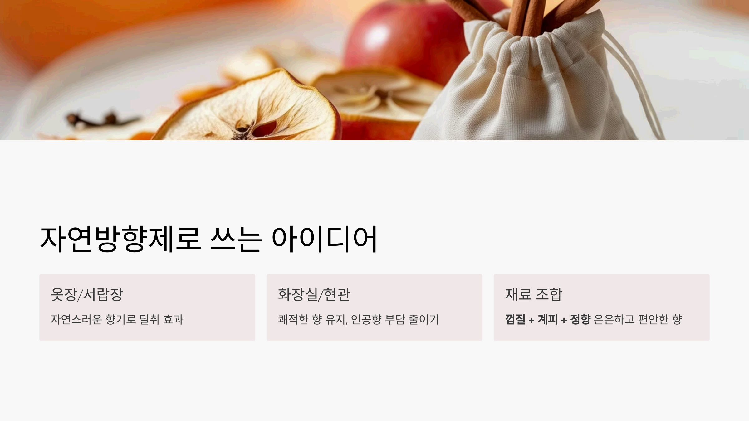 | 화장실/현관 | 쾌적한 향 유지, 인공향 부담 줄이기 |