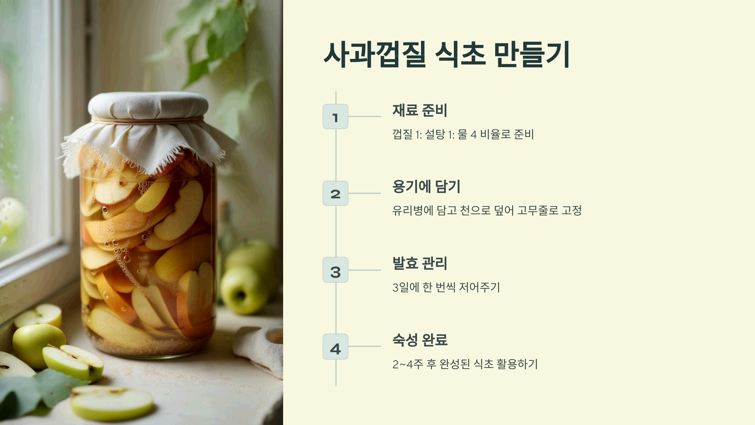 유리병에 사과껍질과 설탕(또는 꿀), 그리고 정수물만 넣고 2주~4주 숙성시키는 게 포인트!