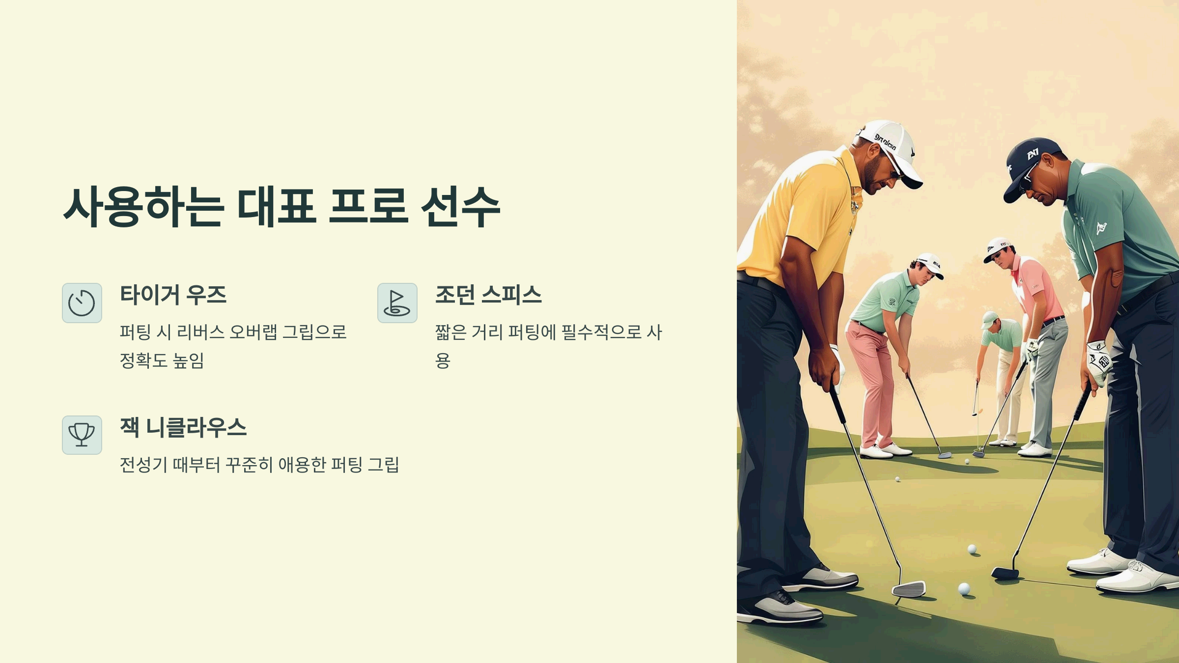 | 리버스 오버랩 | 손목 흔들림 최소화, 안정된 방향성 | 타이거 우즈, 조던 스피스 |