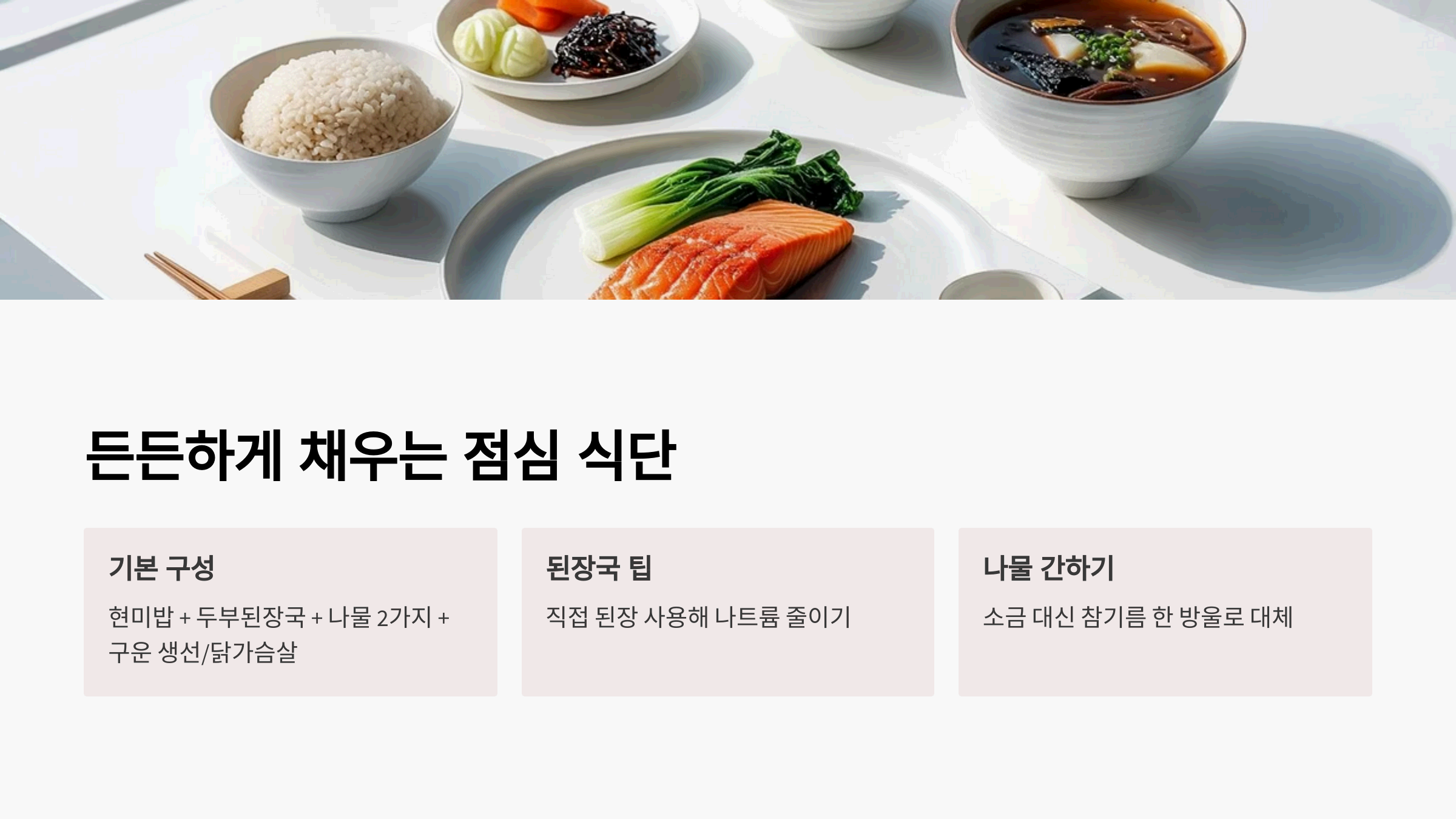 저희 집 점심 기본 구성이에요~ ✅ 현미밥 + 두부된장국 + 나물 2가지 + 구운 연어 or 닭가슴살 밥은 반 공기면 충분! 된장국은 직접 된장 쓰면 나트륨 줄이면서 감칠맛은 그대로예요.